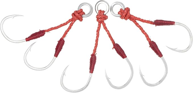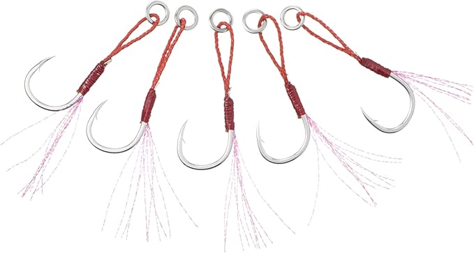 フック形状はSLJゲームにベストマッチする形状をチョイス。サイズ設定に当たっては、ジグ本体に引っかかってしまうなどのトラブルが少ないようなセッティングとした。ティンセルの形状や数量も様々なタイプをテストしベストな量、長さをチョイス。ターゲットを誘う。